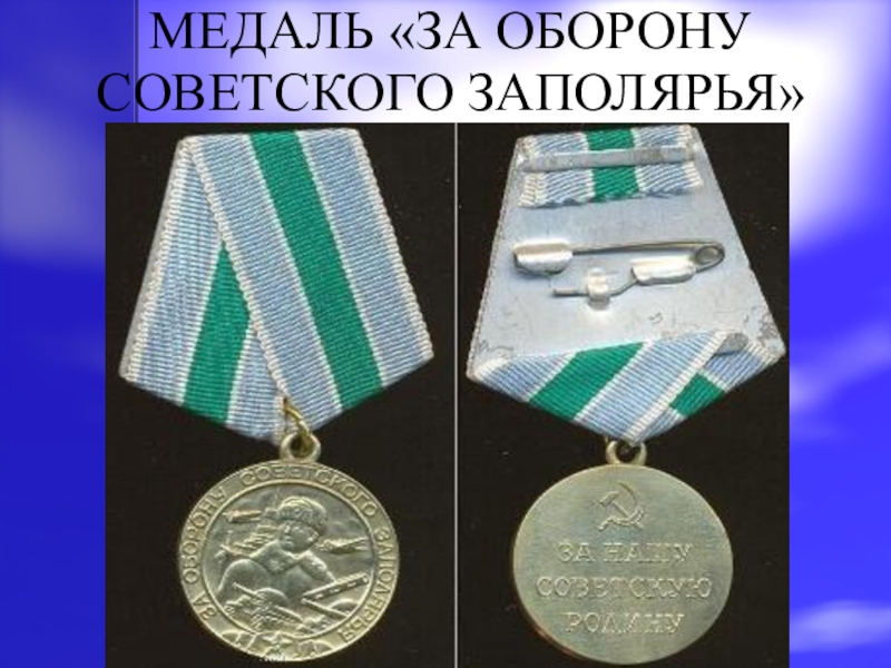 Слайд 13МЕДАЛЬ «ЗА ОБОРОНУ СОВЕТСКОГО ЗАПОЛЯРЬЯ»