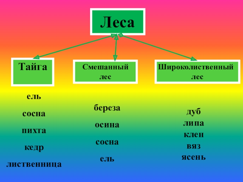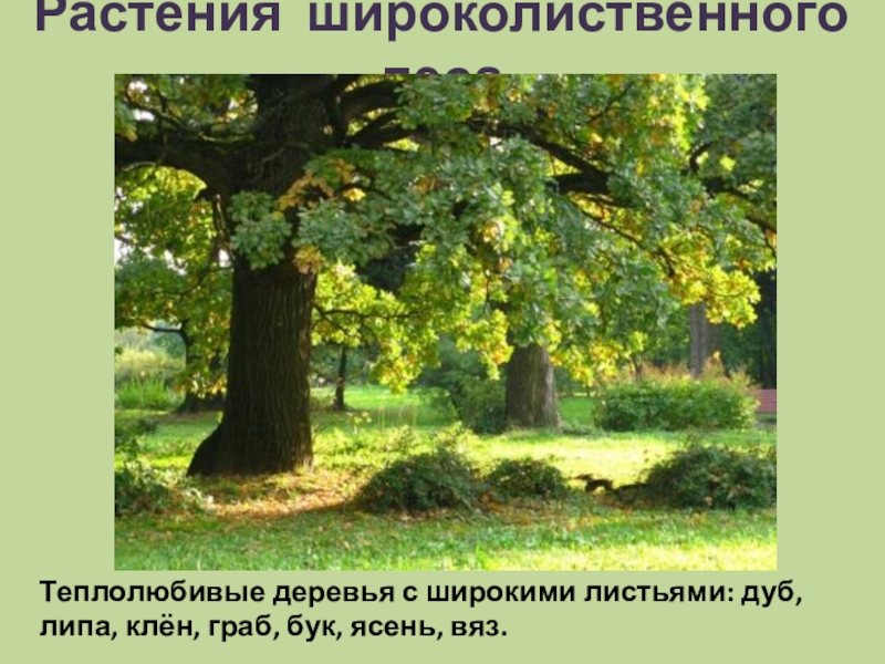 Теплолюбивые деревья с широкими листьями: дуб, липа, клён, граб,