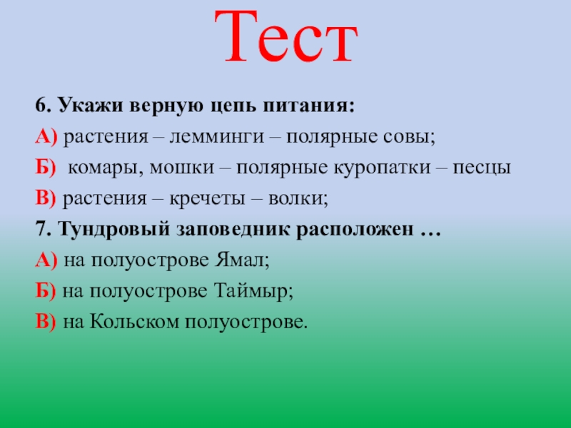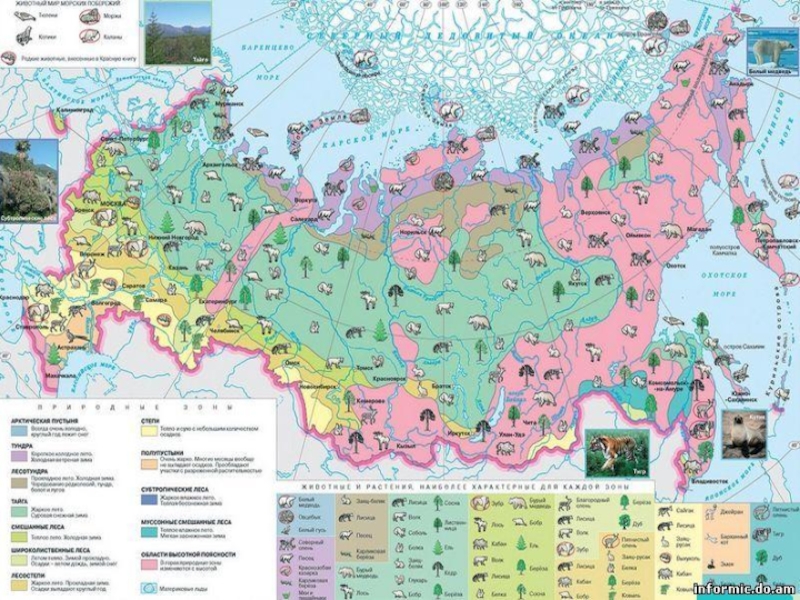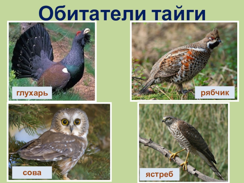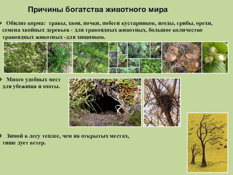 побеги кустарников, ягоды, грибы, орехи, семена хвойных деревьев - для травоядных животных, большое количество травоядных животных -для хищников.