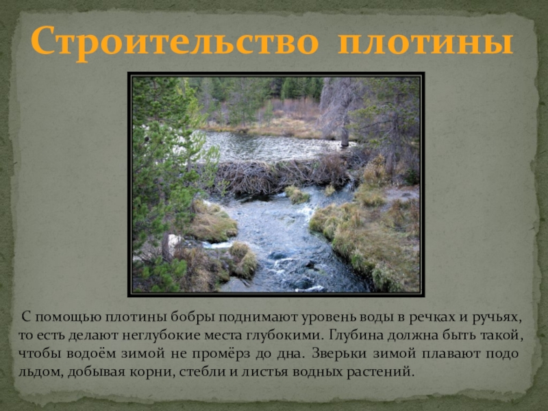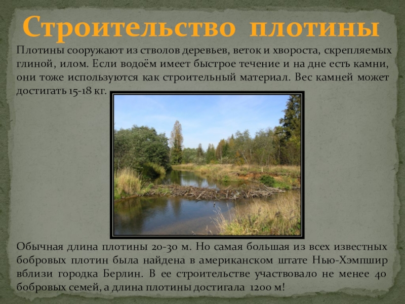 Плотины сооружают из стволов деревьев, веток и хвороста, скрепляемых глиной, илом. Если водоём имеет быстрое течение и на дне есть камни, они тоже используются как строительный материал. Вес камней может достигать 15-18 кг.