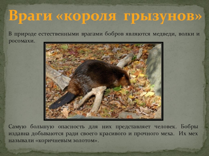 В природе естественными врагами бобров являются медведи, волки и росомахи.