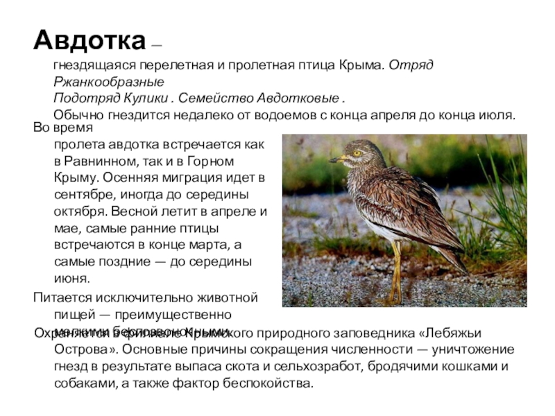 Во время пролета авдотка встречается как в Равнинном, так и в Горном Крыму. Осенняя миграция идет в сентябре, иногда до середины октября. Весной летит в апреле и мае, самые ранние птицы встречаются в конце марта, а самые поздние — до середины июня.
