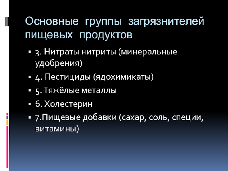 Основные группы загрязнителей пищевых продуктов3. Нитраты нитриты (минеральные удобрения)4. Пестициды (ядохимикаты) 5. Тяжёлые металлы6. Холестерин7.Пищевые добавки (сахар,