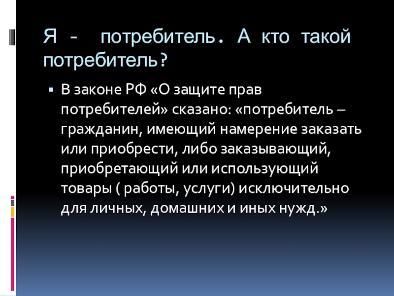 Я - потребитель. А кто такой потребитель?В законе РФ «О защите прав потребителей» сказано: «потребитель – гражданин, имеющий намерение заказать или приобрести, либо заказывающий, приобретающий или использующий товары ( работы, услуги) исключительно для личных, домашних и