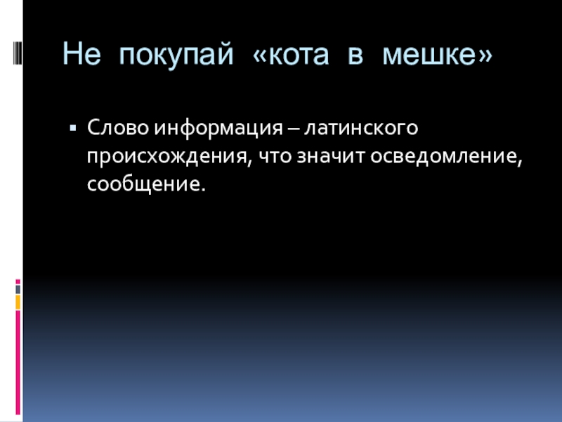 Не покупай «кота в мешке»Слово информация – латинского происхождения, что значит осведомление, сообщение.
