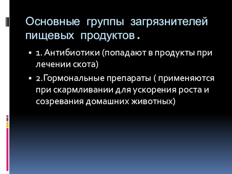 Основные группы загрязнителей пищевых продуктов.1. Антибиотики (попадают в продукты при лечении скота)2.Гормональные препараты ( применяются при скармливании