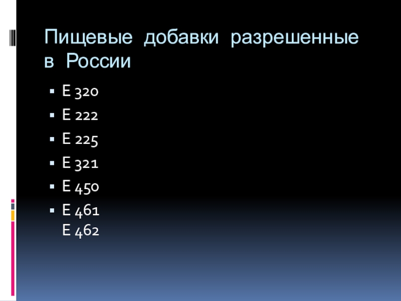 Пищевые добавки разрешенные в РоссииЕ 320Е 222Е 225Е 321Е 450Е 461 Е 462