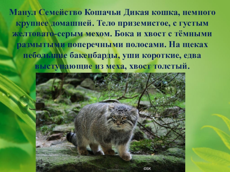 Манул Семейство Кошачьи Дикая кошка, немного крупнее домашней. Тело приземистое, с густым желтовато-серым мехом. Бока и хвост
