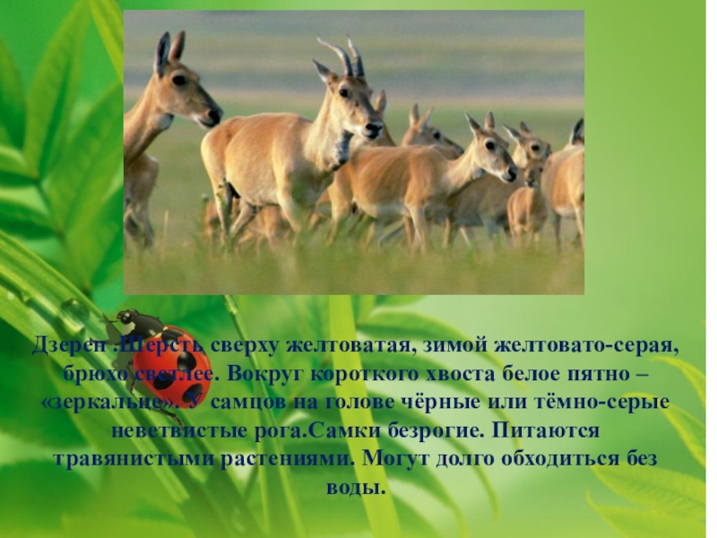 Дзерен .Шерсть сверху желтоватая, зимой желтовато-серая, брюхо светлее. Вокруг короткого хвоста белое пятно – «зеркальце». У самцов