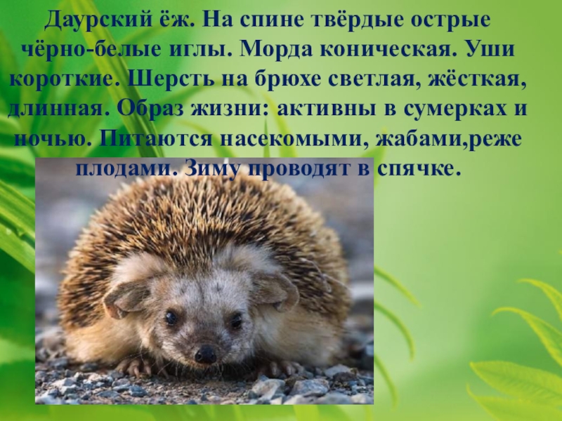 Слайд 11Даурский ёж. На спине твёрдые острые чёрно-белые иглы. Морда коническая. Уши