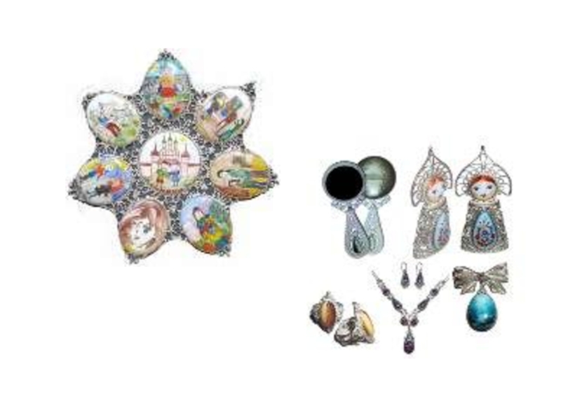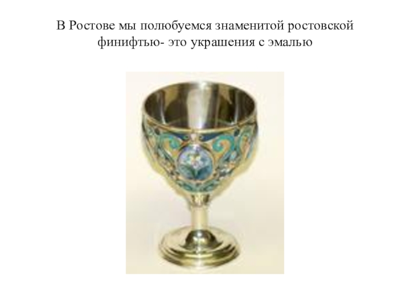 Слайд 14 В Ростове мы полюбуемся знаменитой ростовской финифтью- это украшения с эмалью