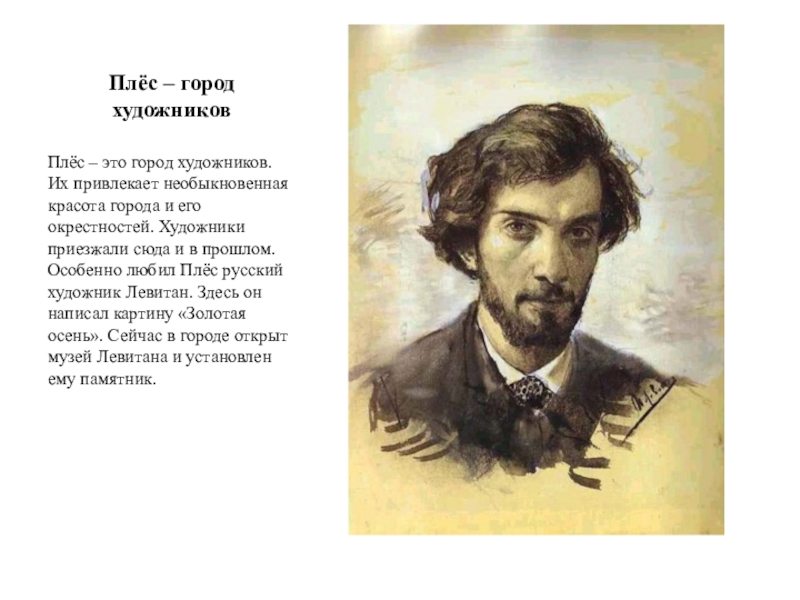 необыкновенная красота города и его окрестностей. Художники приезжали сюда и в прошлом. Особенно любил Плёс русский художник Левитан. Здесь он написал картину «Золотая осень». Сейчас в городе открыт музей Левитана и установлен ему памятник.