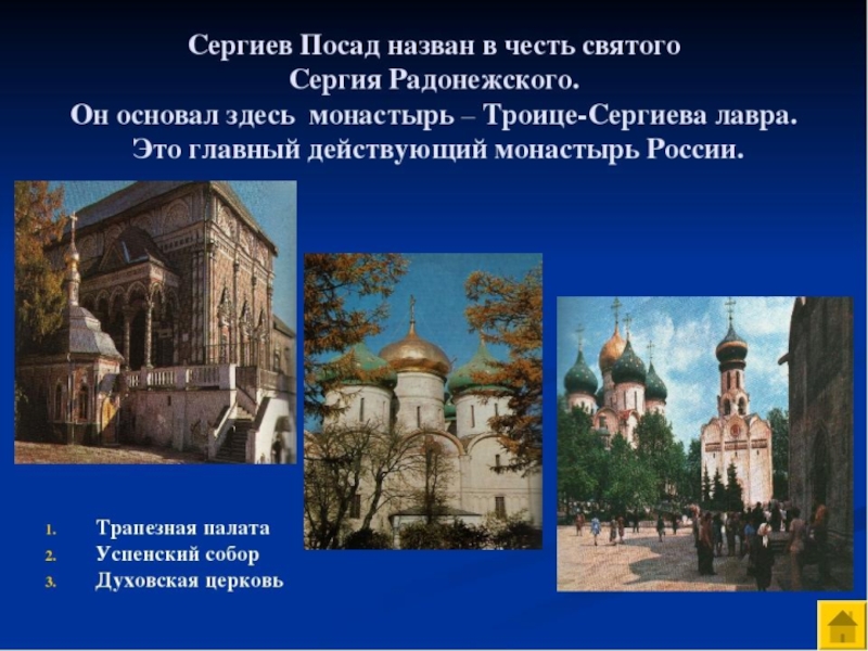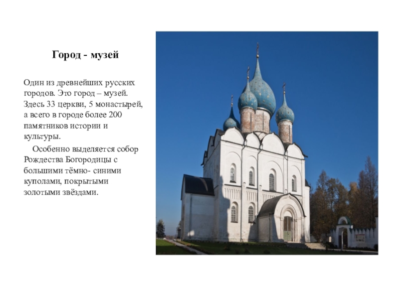 Особенно выделяется собор Рождества Богородицы с большими тёмно- синими куполами, покрытыми золотыми звёздами.