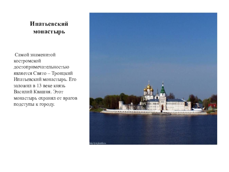 Ипатьевский монастырь Самой знаменитой костромской достопримечательностью является Свято – Троицкий Ипатьевский монастырь. Его заложил в 13 веке