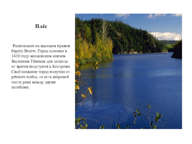 Плёс Расположен на высоком правом берегу Волги. Город основан в 1410 году московским князем Василием Тёмным для