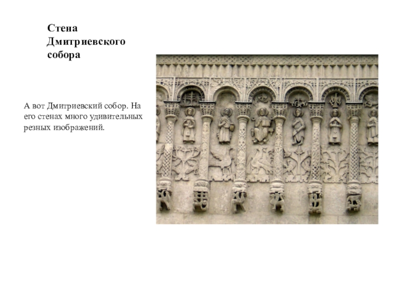 Стена Дмитриевского собора А вот Дмитриевский собор. На его стенах много удивительных резных изображений.
