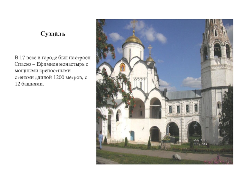 Суздаль В 17 веке в городе был построен Спаско – Ефимиев монастырь с мощными крепостными стенами длиной