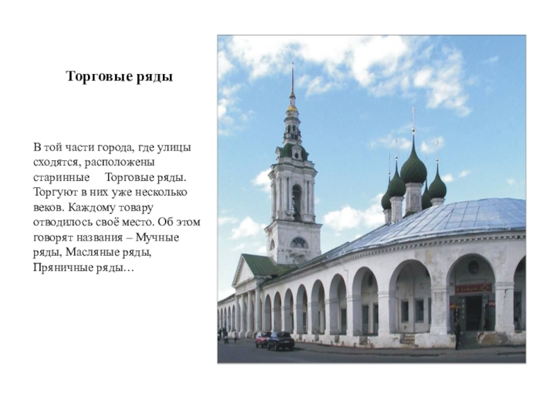 Торговые ряды В той части города, где улицы сходятся, расположены старинные   Торговые ряды. Торгуют в