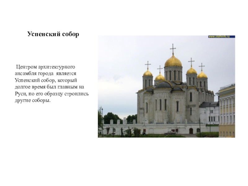 Успенский собор Центром архитектурного ансамбля города является Успенский собор, который долгое время был главным на Руси, по