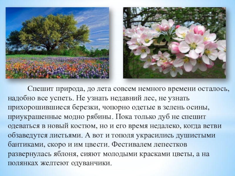 времени осталось, надобно все успеть. Не узнать недавний лес, не узнать прихорошившиеся березки, чопорно одетые в зелень осины, приукрашенные модно рябины. Пока только дуб не спешит одеваться в новый костюм, но и его время недалеко, когда ветви обзаведутся листьями. А вот и тополя украсились душистыми бантиками, скоро и им цвести. Фестивалем лепестков развернулась яблоня, сияют молодыми красками цветы, а на полянках желтеют одуванчики.