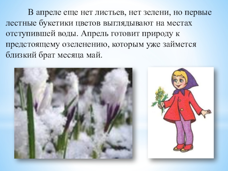 зелени, но первые лестные букетики цветов выглядывают на местах отступившей воды. Апрель готовит природу к предстоящему озеленению, которым уже займется близкий брат месяца май.