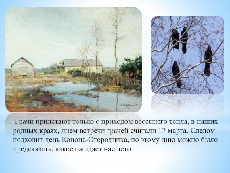 днем встречи грачей считали 17 марта. Следом подходит день Конона-Огородника, по этому дню можно было предсказать, какое ожидает нас лето.