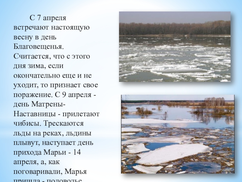 день Благовещенья. Считается, что с этого дня зима, если окончательно еще и не уходит, то признает свое поражение. С 9 апреля - день Матрены-Наставницы - прилетают чибисы. Трескаются льды на реках, льдины плывут, наступает день прихода Марьи - 14 апреля, а, как поговаривали, Марья пришла - половодье принесла.