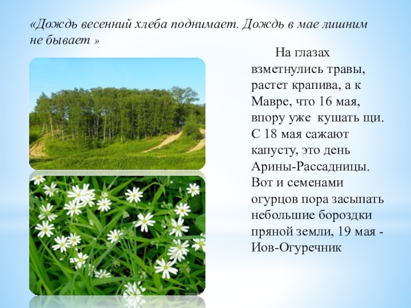 «Дождь весенний хлеба поднимает. Дождь в мае лишним не бывает »