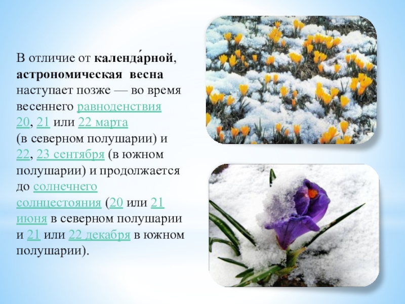 Слайд 4Состоит из трёх месяцев: в северном полушарии — марта, апреля и мая, в Южном — сентября, октября и ноября.