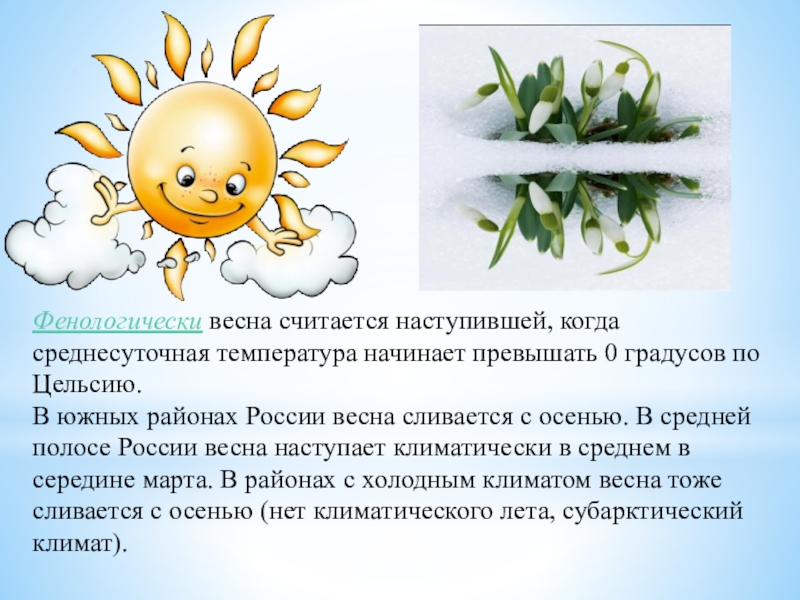 Слайд 7Фенологически весна считается наступившей, когда среднесуточная температура начинает превышать 0 градусов по