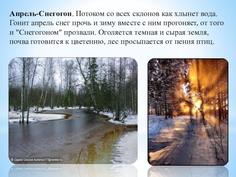 Слайд 12Апрель-Снегогон. Потоком со всех склонов как хлынет вода. Гонит апрель снег