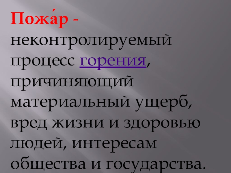 Пожа́р -неконтролируемый процесс горения,причиняющий материальный ущерб, вред жизни и здоровью людей, интересам общества и государства.