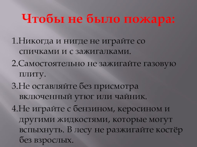 Чтобы не было пожара:1.Никогда и нигде не играйте со спичками и c зажигалками.2.Самостоятельно не зажигайте газовую плиту.3.Не