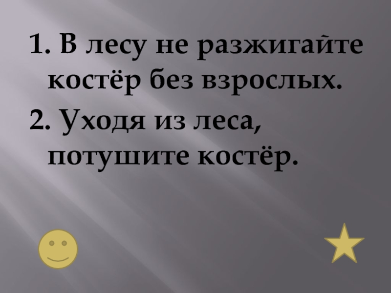 1. В лесу не разжигайте костёр без взрослых.2. Уходя из леса, потушите костёр.