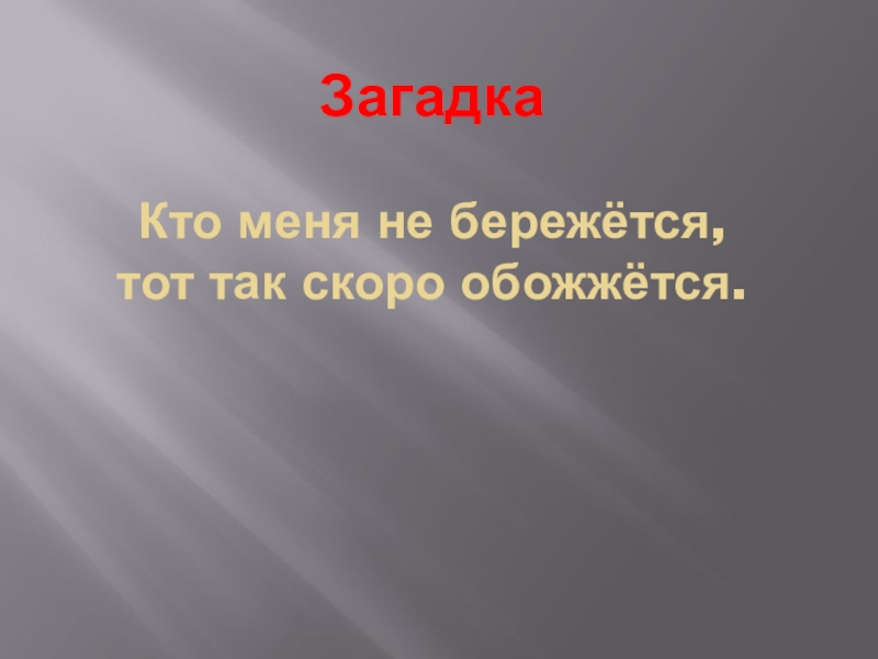Слайд 19Загадка Кто меня не бережётся, тот так скоро обожжётся.