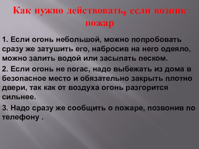 Как нужно действовать, если возник пожар 1. Если огонь небольшой, можно попробовать сразу же затушить его, набросив