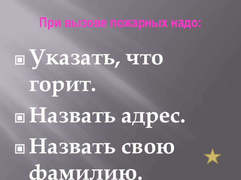 При вызове пожарных надо:Указать, что горит.Назвать адрес.Назвать свою фамилию.