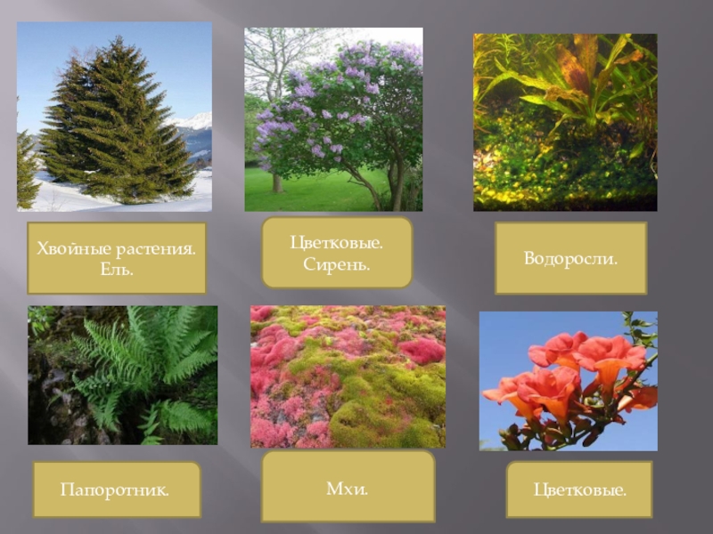 Цветковые растения . СиреньХвойные растения . ЕльМох.Водоросли.Папоротник.Хвойные.