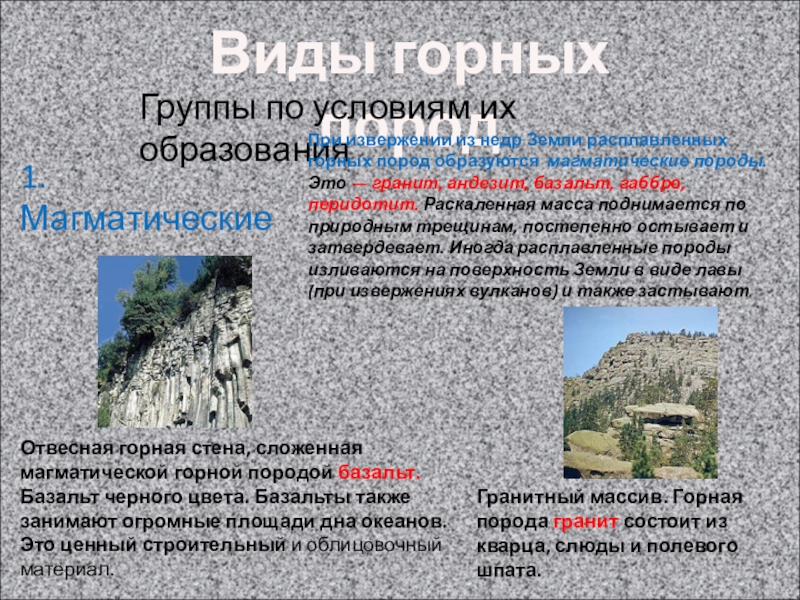 Отвесная горная стена, сложенная магматической горной породой базальт. Базальт черного цвета. Базальты также занимают огромные площади дна океанов. Это ценный строительный и облицовочный материал.