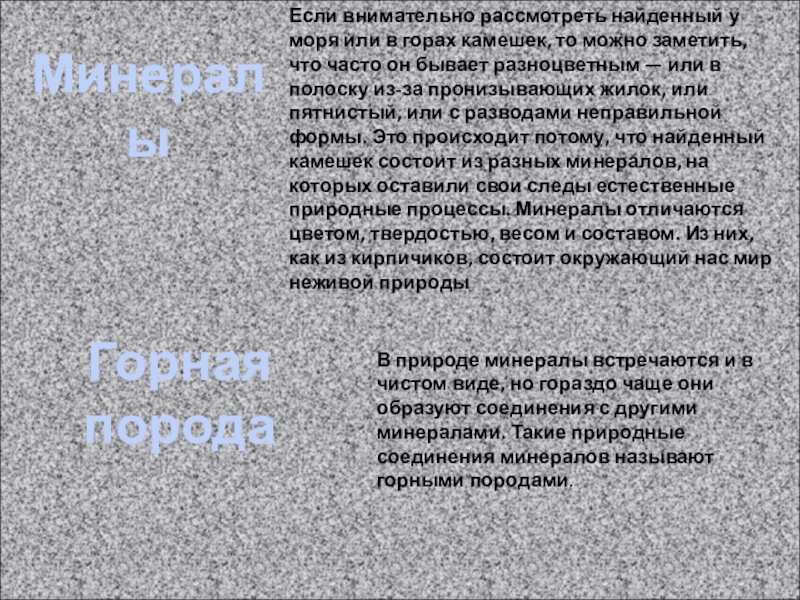 Если внимательно рассмотреть найденный у моря или в горах камешек, то можно заметить, что часто он бывает разноцветным — или в полоску из-за пронизывающих жилок, или пятнистый, или с разводами неправильной формы. Это происходит потому, что найденный камешек состоит из разных минералов, на которых оставили свои следы естественные природные процессы. Минералы отличаются цветом, твердостью, весом и составом. Из них, как из кирпичиков, состоит окружающий нас мир неживой природы