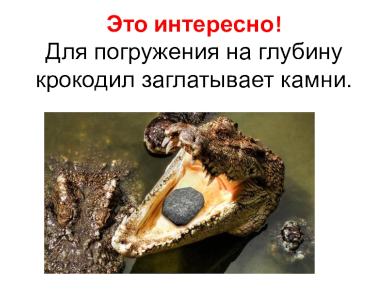 Слайд 8 Это интересно! Для погружения на глубину крокодил заглатывает камни.