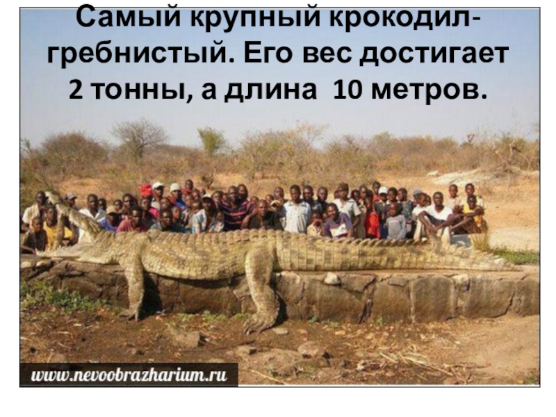 Слайд 4Самый крупный крокодил- гребнистый. Его вес достигает 2 тонны, а длина