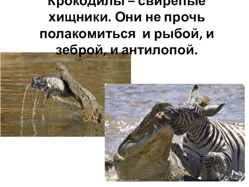 Слайд 6Крокодилы – свирепые хищники. Они не прочь полакомиться и рыбой, и