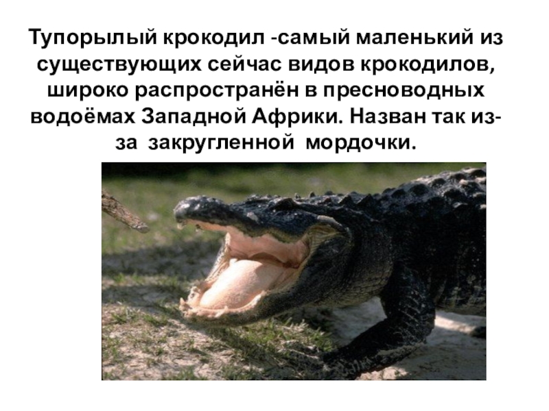 Слайд 5Тупорылый крокодил -самый маленький из существующих сейчас видов крокодилов, широко распространён