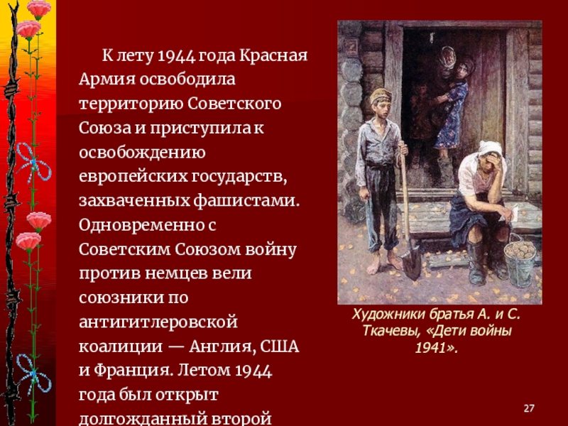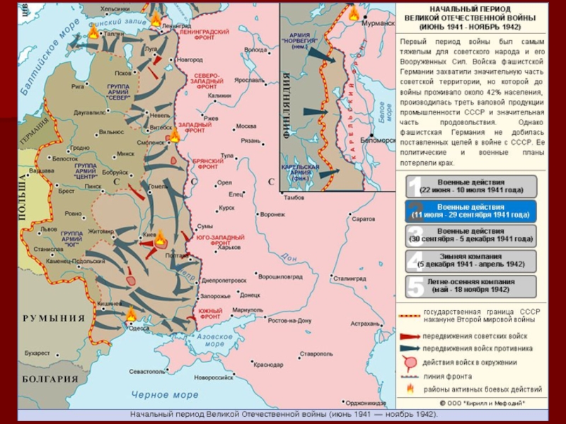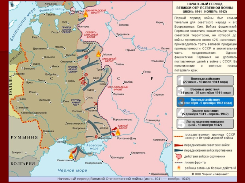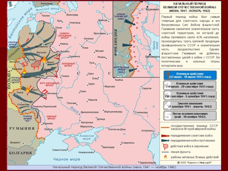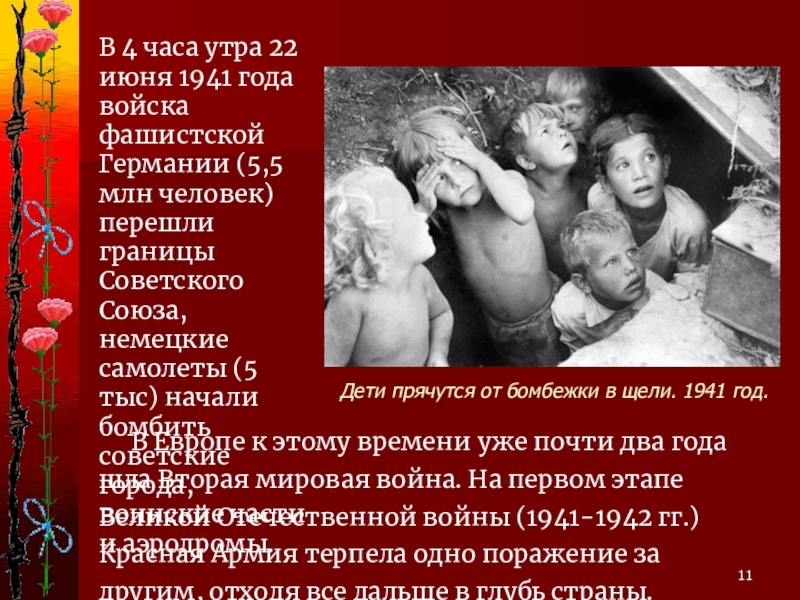 В 4 часа утра 22 июня 1941 года войска фашистской Германии (5,5 млн человек) перешли границы Советского Союза, немецкие самолеты (5 тыс) начали бомбить советские города, воинские части и аэродромы.