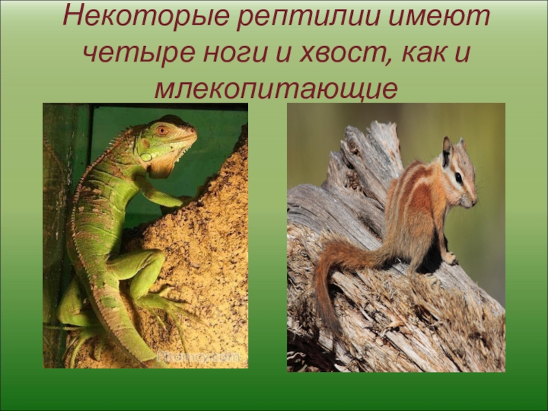 Слайд 13Некоторые рептилии имеют четыре ноги и хвост, как и млекопитающие
