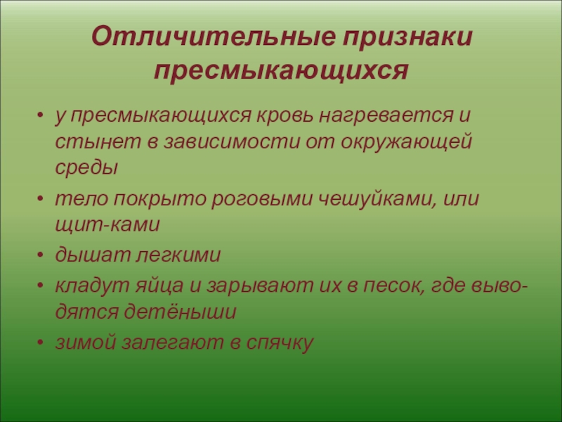 Отличительные признаки пресмыкающихсяу пресмыкающихся кровь нагревается и стынет в зависимости от окружающей средытело покрыто роговыми чешуйками, или