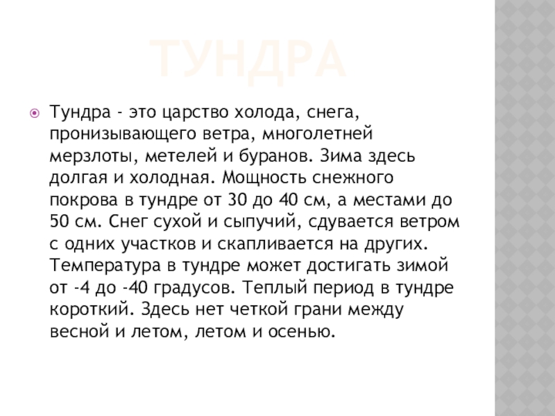 и буранов. Зима здесь долгая и холодная. Мощность снежного покрова в тундре от 30 до 40 см, а местами до 50 см. Снег сухой и сыпучий, сдувается ветром с одних участков и скапливается на других. Температура в тундре может достигать зимой от -4 до -40 градусов. Теплый период в тундре короткий. Здесь нет четкой грани между весной и летом, летом и осенью.