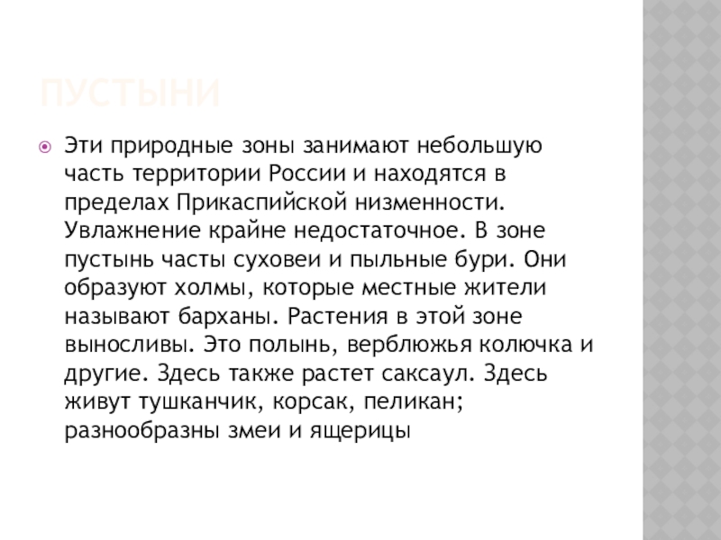 в пределах Прикаспийской низменности. Увлажнение крайне недостаточное. В зоне пустынь часты суховеи и пыльные бури. Они образуют холмы, которые местные жители называют барханы. Растения в этой зоне выносливы. Это полынь, верблюжья колючка и другие. Здесь также растет саксаул. Здесь живут тушканчик, корсак, пеликан; разнообразны змеи и ящерицы