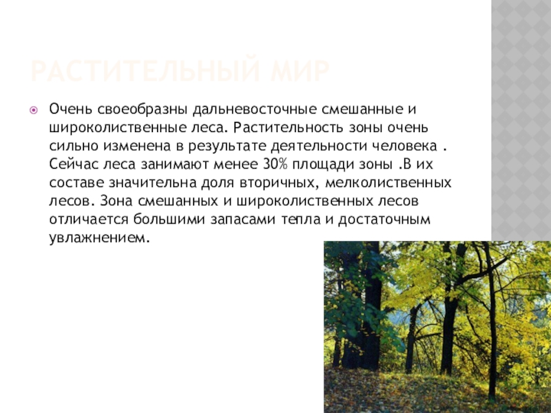 сильно изменена в результате деятельности человека .Сейчас леса занимают менее 30% площади зоны .В их составе значительна доля вторичных, мелколиственных лесов. Зона смешанных и широколиственных лесов отличается большими запасами тепла и достаточным увлажнением.